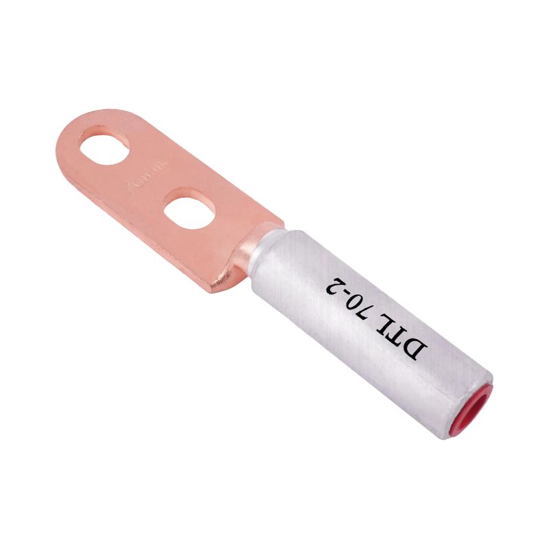 The DTL-2 double-hole bimetallic lug is designed for reliable termination between aluminum conductors and copper busbars. It is manufactured from 1070 aluminum and T3 copper, joined through a stable friction-welding process. This structure ensures long-term conductivity and minimizes the risk of galvanic corrosion—an issue that often appears when aluminum cables are connected directly to copper equipment.